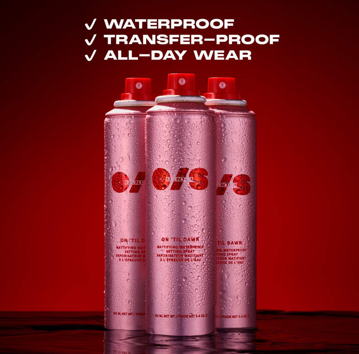 Un spray con acabado mate resistente al agua por 16 horas en una fórmula resistente a la transferencia con extracto de té verde y hamamelis que absorbe la grasa.